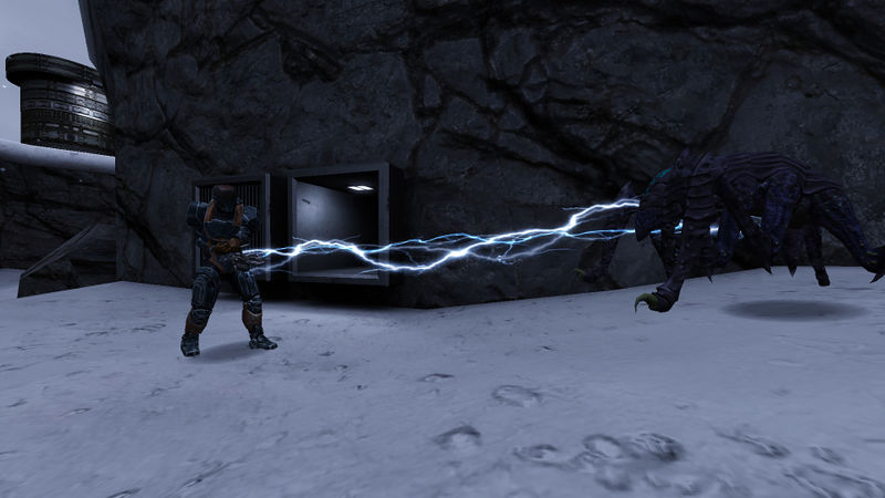 Alien Advanced Marauder with electric attack against Human wearing Battle Suit